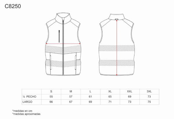 Chaleco reversible acolchado. Cuello alto con cierre de cremallera de nylon. Solapa protectora cubriendo la cremallera. Ribeteado con bies elástico a contraste. Exterior: Combinado con alta visibilidad y cintas reflectantes segmentadas. Dos bolsos laterales interiores con cierre de cremallera. Un bolso de pecho interior con cierre de cremallera. Dos cintas reflectantes segmentadas termoadhesivas en pecho y espalda. Colgador en la parte trasera del cuello. Interior: Acolchado pespunteado. Dos bolsos laterales interiores con cierre de cremallera.